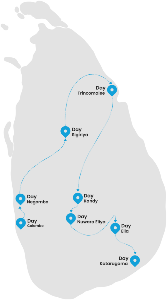 Route: Colombo → Negombo → Sigiriya → Trincomalee → Kandy → Nuwara Eliya → Ella → Kataragama → Colombo